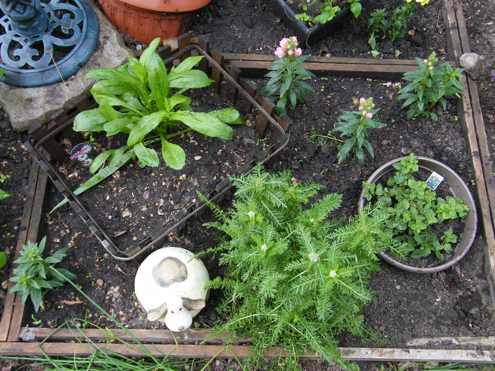 Quadrant 3 is mostly flowers, with daisies (which also survived the winter) in the basket on the left, yarrow in the bottom centre, and my new oregano plant on the right. Snapdragons here and there for colour.